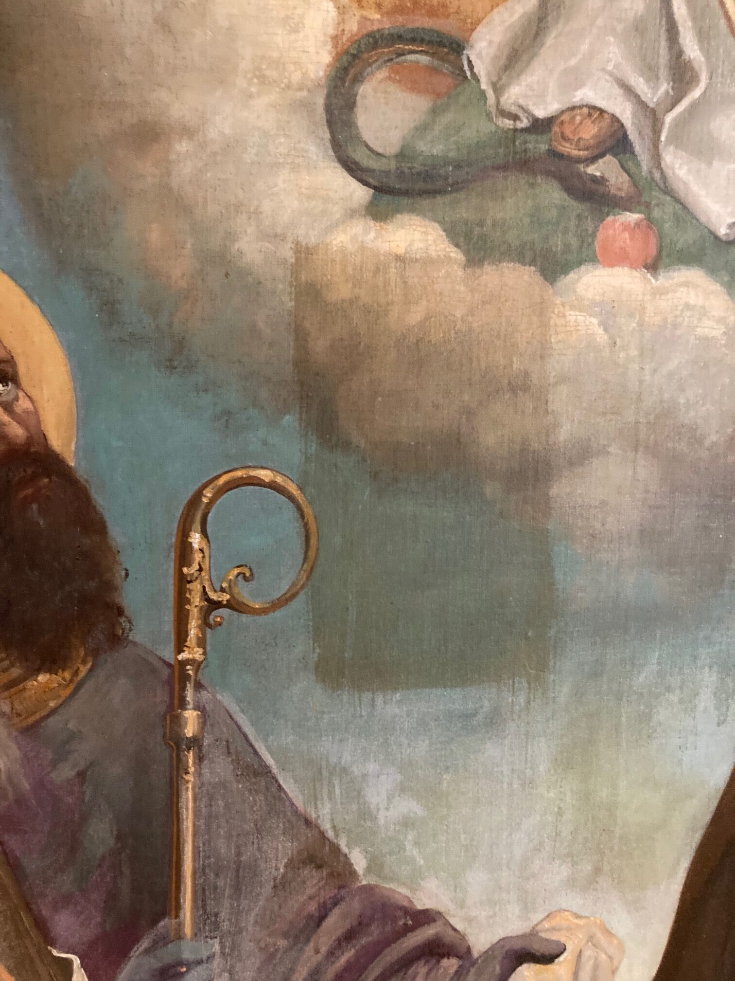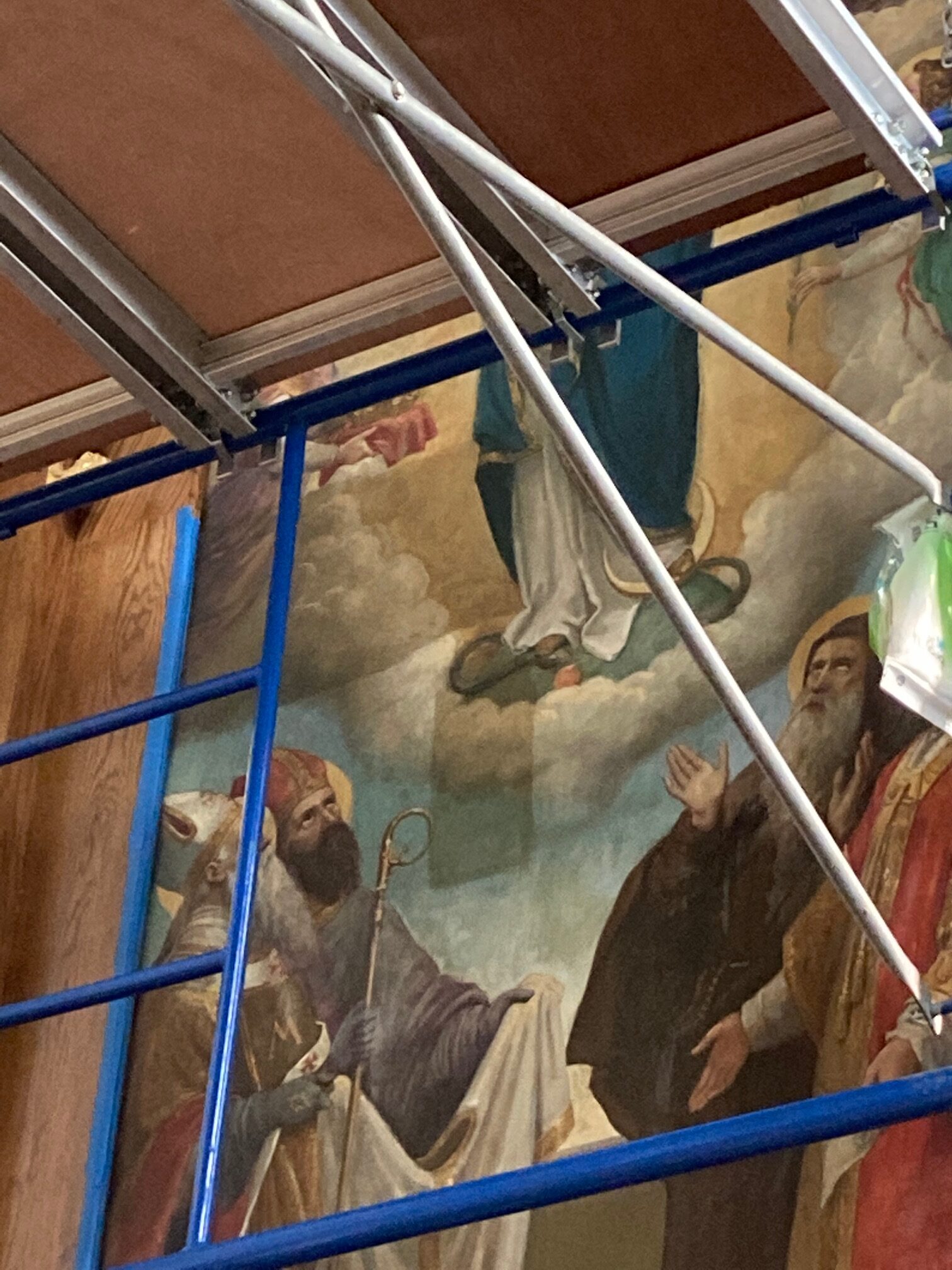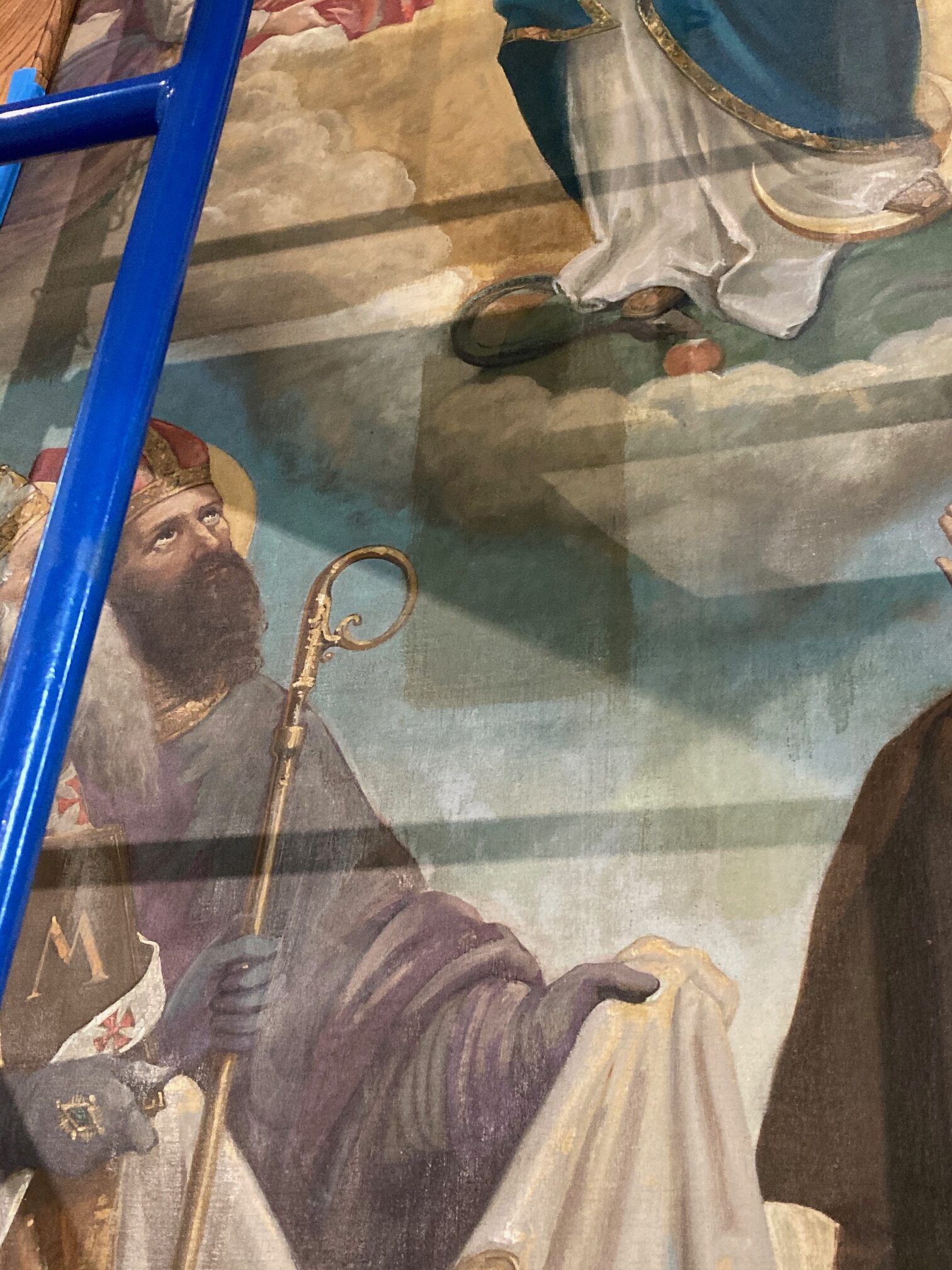This past week, an art restorer from David Terry Fine Art Studios cleaned and did some minimal restoration on the Assumption painting in the reredos. During the process, he took a few pictures to show before/after areas. We think everyone will be happy with the results. Check out some of the photos below courtesy of Fred Fochtman from David Terry Fine Art Studios.