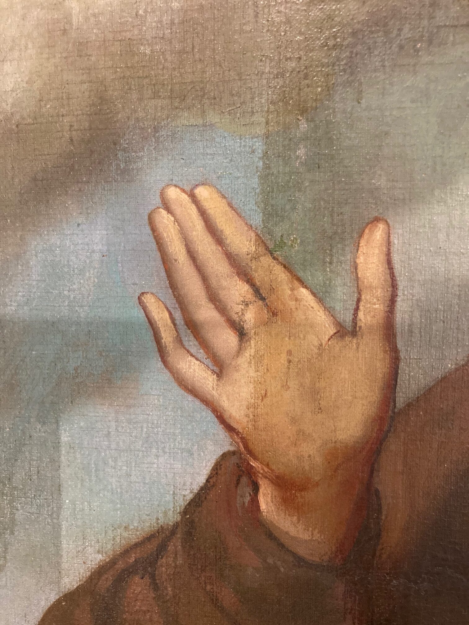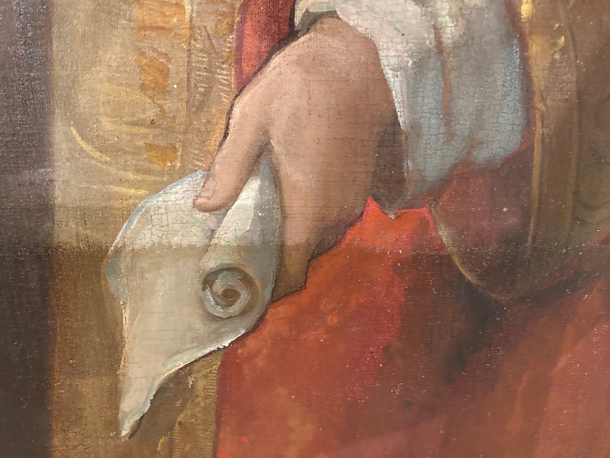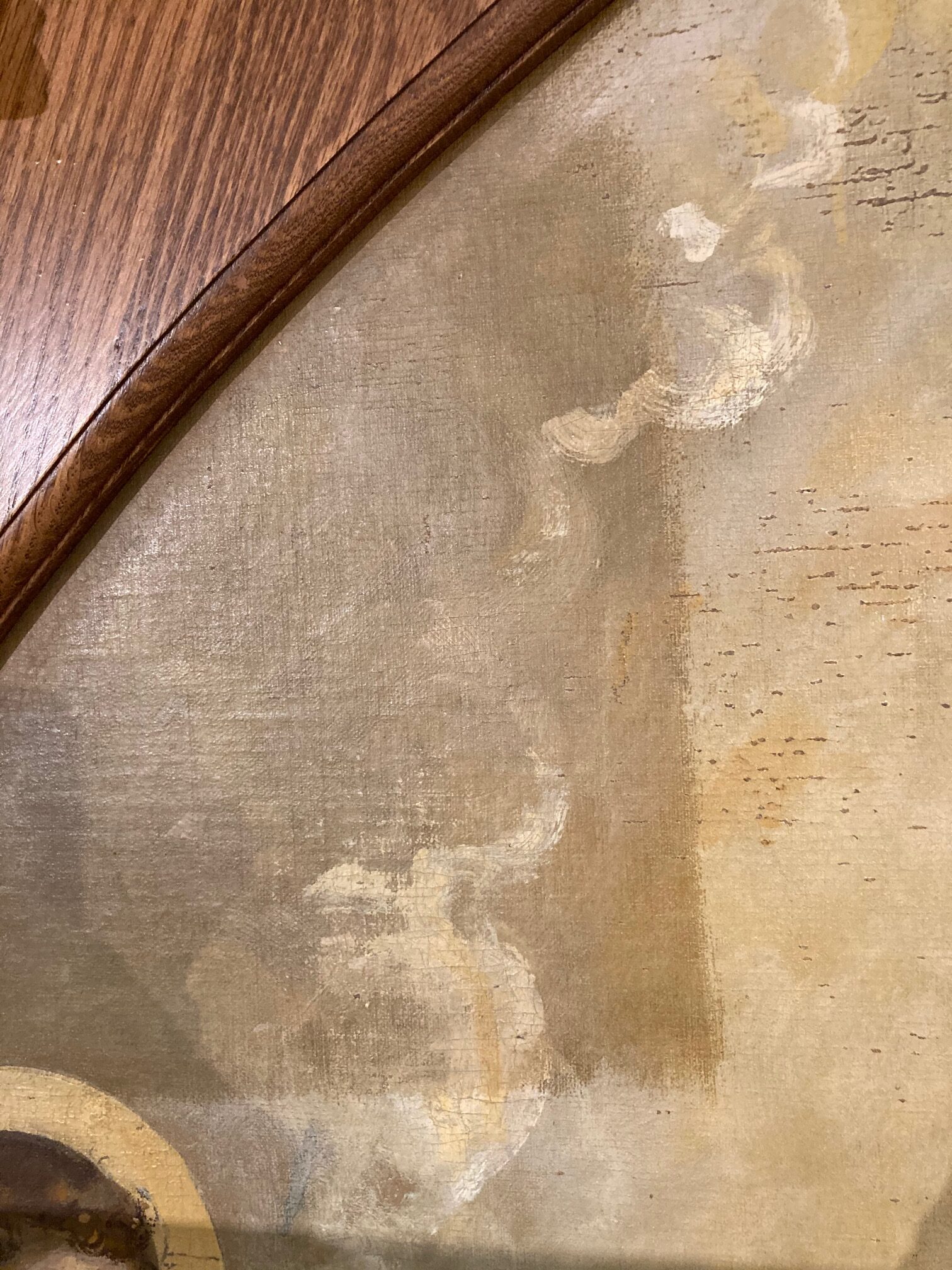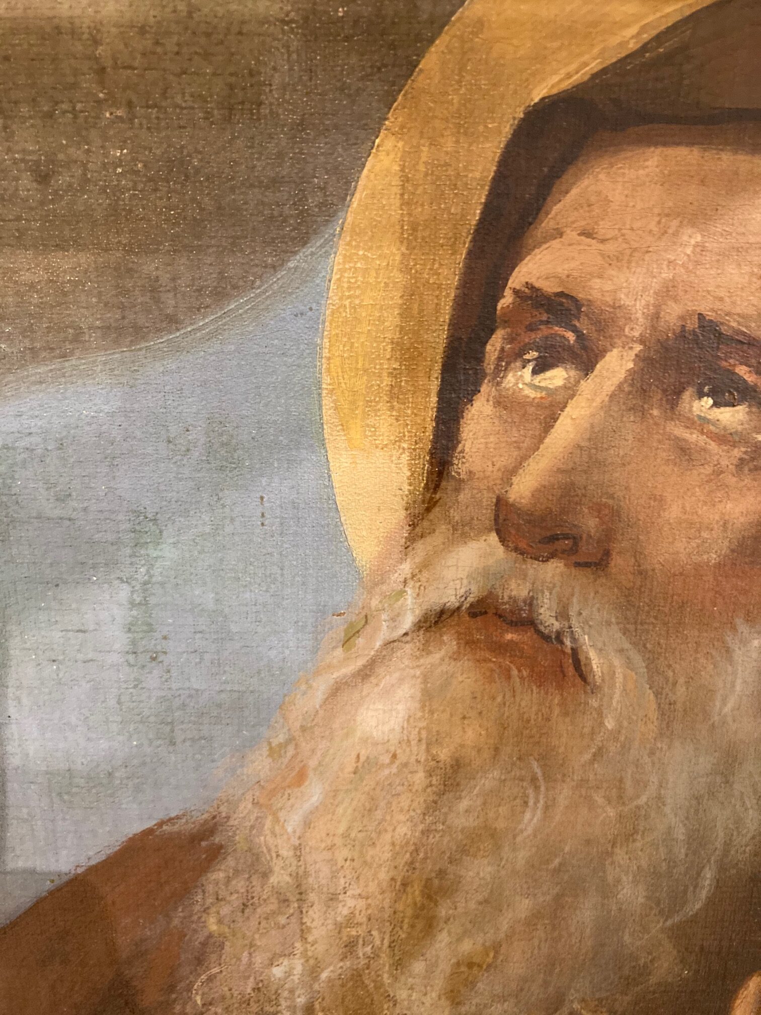 This past week, an art restorer from David Terry Fine Art Studios cleaned and did some minimal restoration on the Assumption painting in the reredos. During the process, he took a few pictures to show before/after areas. We think everyone will be happy with the results. Check out some of the photos below courtesy of Fred Fochtman from David Terry Fine Art Studios.